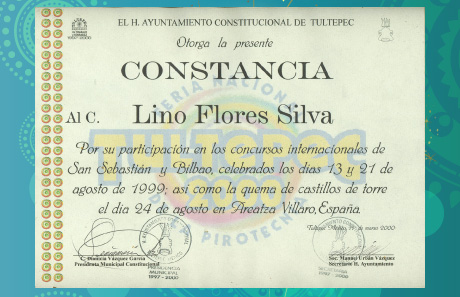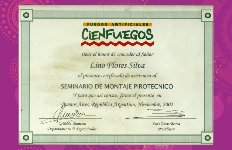 Certificado de asistencia al "Seminario de Montaje Pirotécnico", capacitados profesionalmente para garantizar el mejor de los espectáculos.